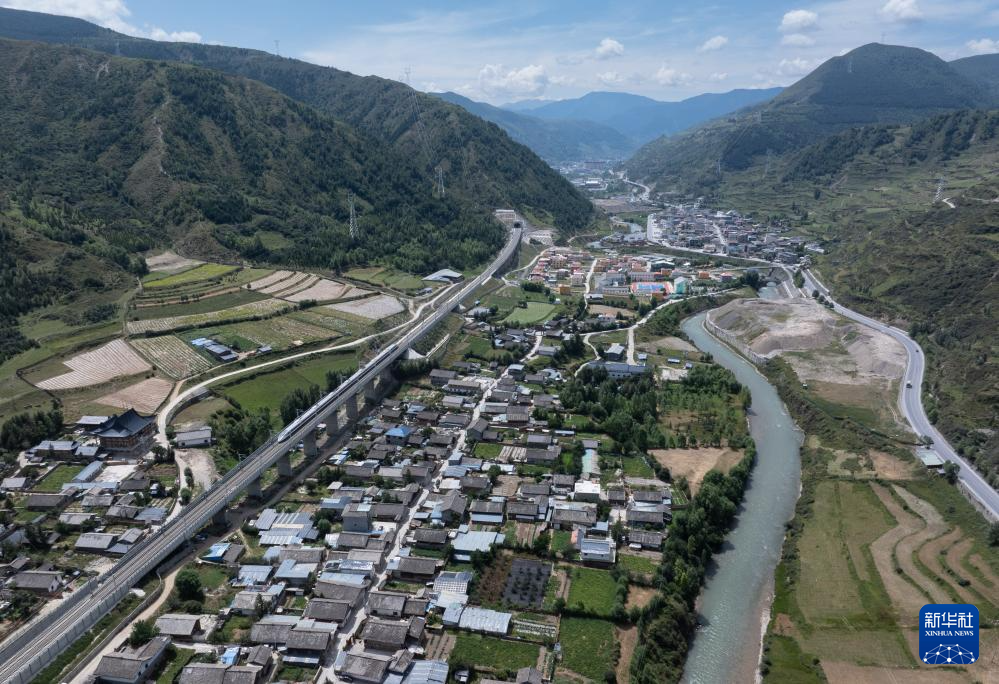 C5764次列車行進(jìn)在川青鐵路黃龍九寨站至松潘站間,鐵路邊是岷江和213國道(8月30日攝,無人機(jī)照片)。新華社記者 江宏景 攝
