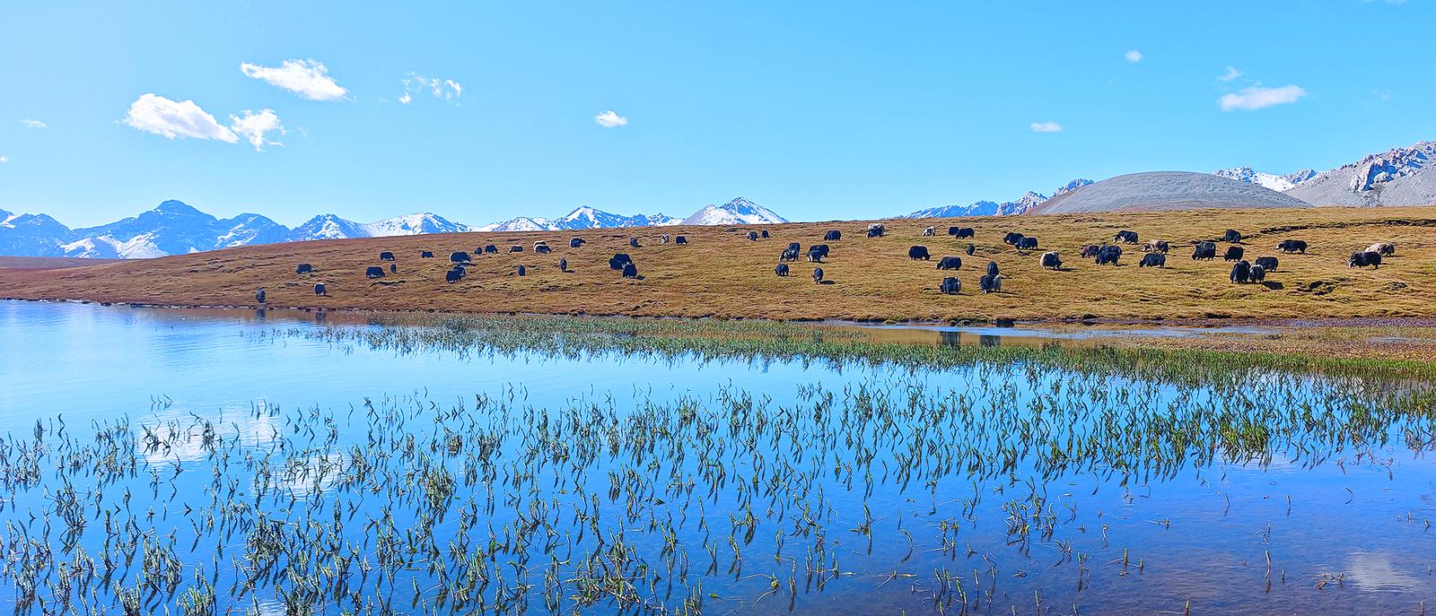 人在這里顯得格外渺小。一路左拐右折,漫長(zhǎng)的車(chē)程中,與我們相伴的有高原反應(yīng),也有窗外無(wú)窮無(wú)盡的美麗風(fēng)景。陽(yáng)光明澈,天空澄藍(lán),綿延的山川仿佛永無(wú)終點(diǎn),大團(tuán)的云在山坡上投下柔和的陰影。時(shí)不時(shí)遇到成群的牦牛,旁若無(wú)人地吃草、蹚水。