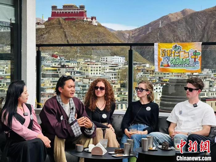 圖為外國(guó)嘉賓與玉樹(shù)當(dāng)?shù)匚穆谩巴扑]官”交流分享。馬銘言 攝