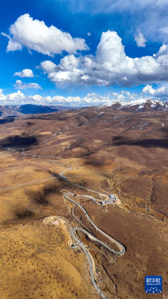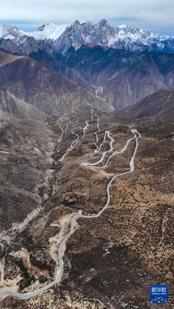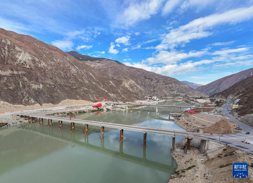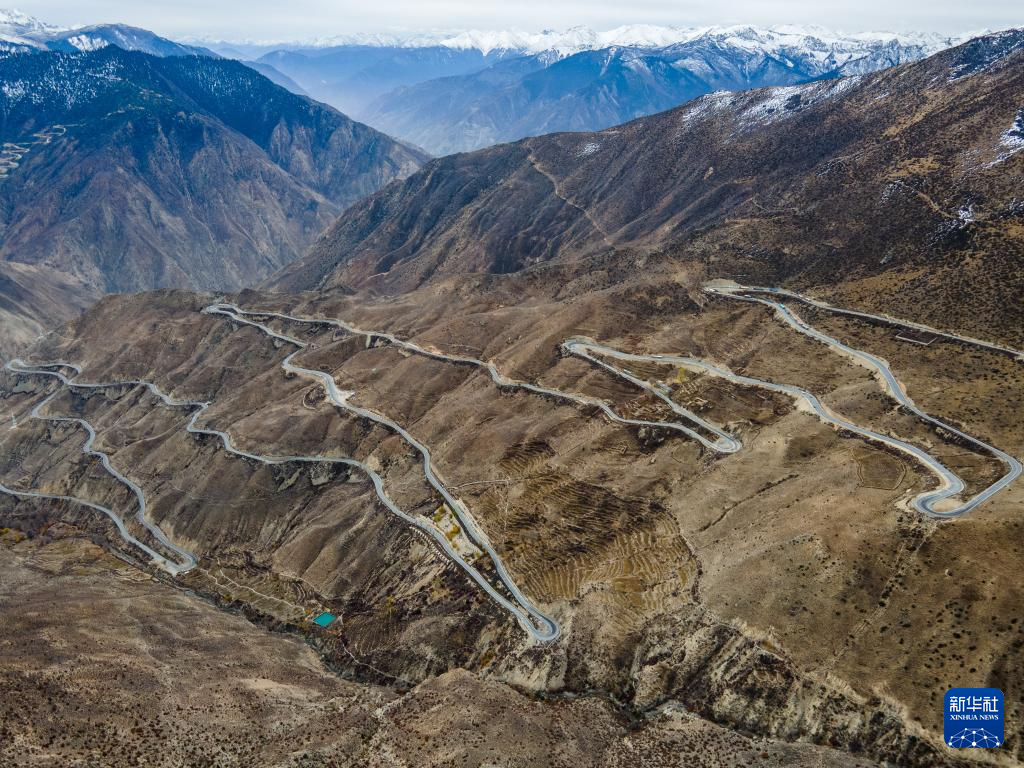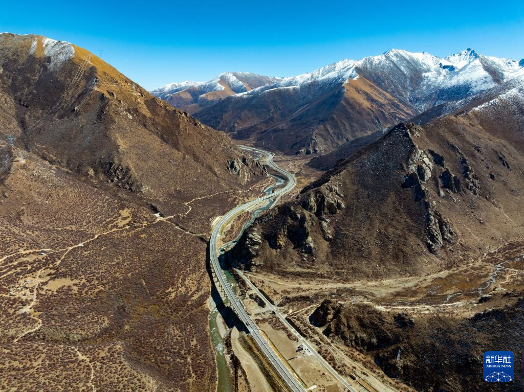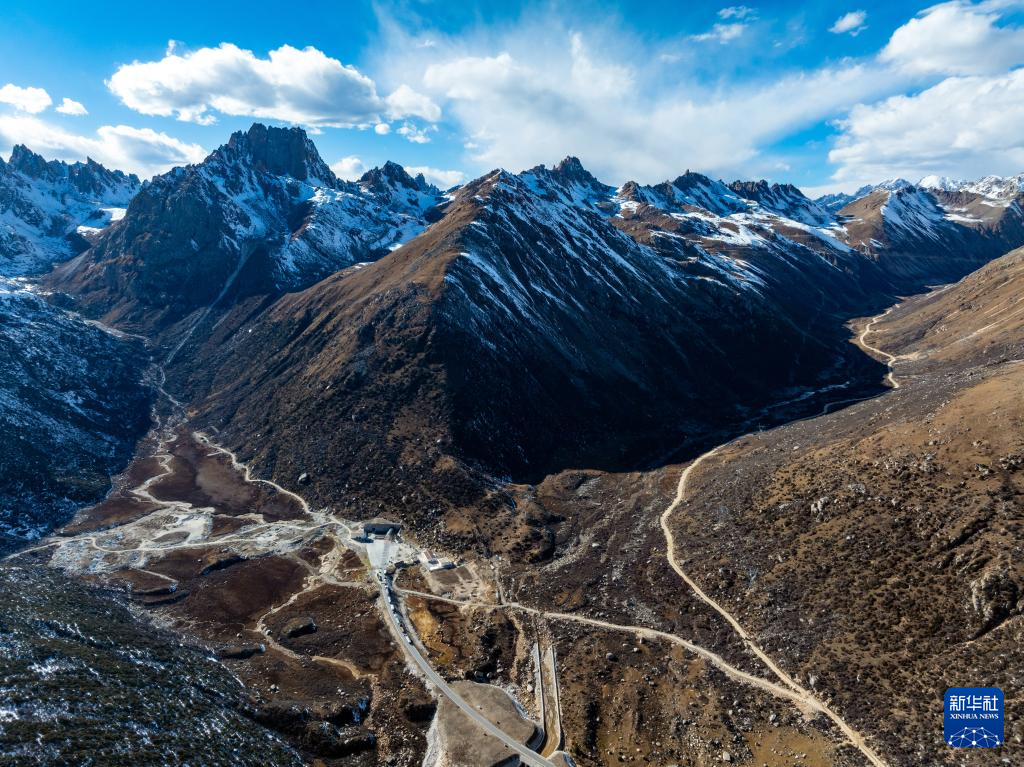連接四川和西藏的國道317公路崗?fù)写髽蚶蠘颍h(yuǎn)處是新修的崗?fù)写髽颍?1月2日攝,無人機(jī)照片)。新華社記者 王曦 攝