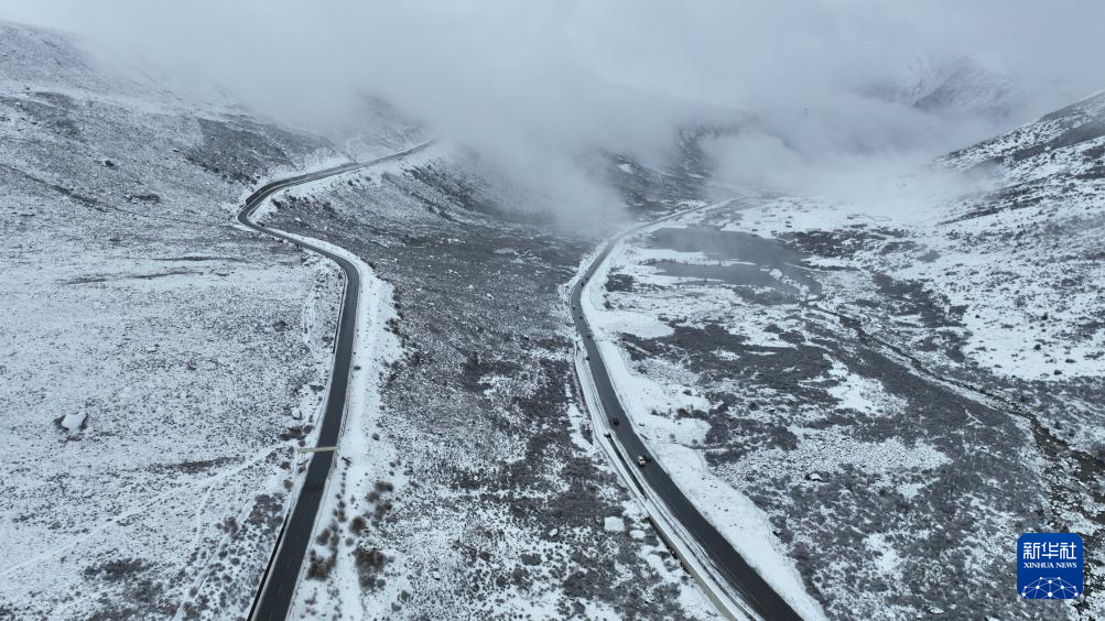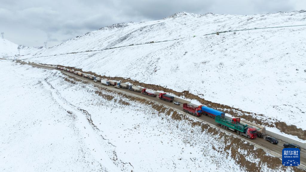 雪后,在西藏自治區(qū)左貢縣境內(nèi),車輛在通往東達(dá)山埡口的國道318公路上等待通行(11月6日攝,無人機(jī)照片)。新華社記者 沈伯韓 攝
