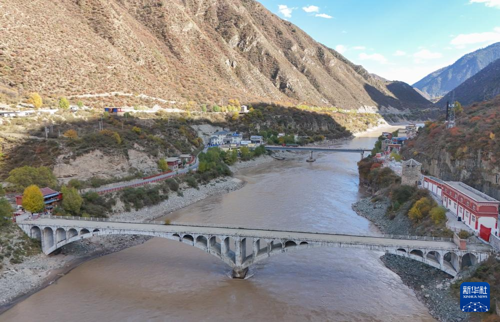 在四川省甘孜藏族自治州巴塘縣竹巴龍鄉(xiāng)拍攝的國道318公路連接四川和西藏的金沙江大橋老橋(近)和新橋(11月6日攝,無人機(jī)照片)。新華社記者 王曦 攝