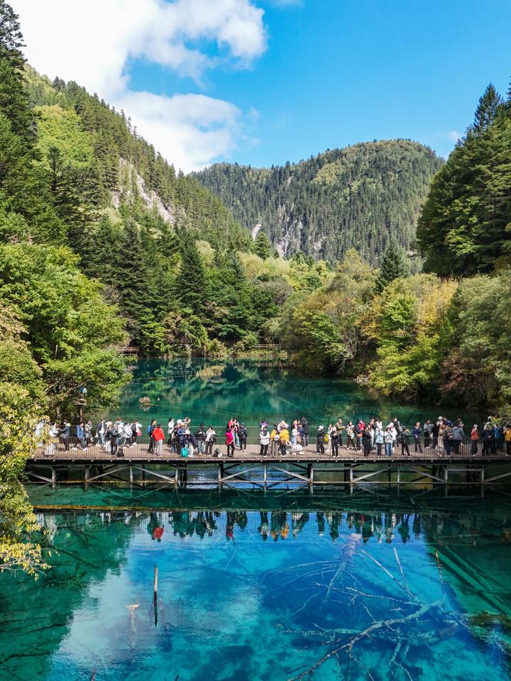 10月10日,游客在九寨溝景區(qū)五花海游覽觀光。新華社記者 王曦 攝