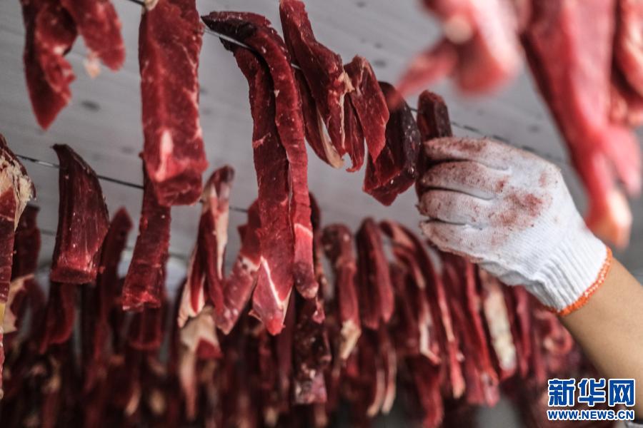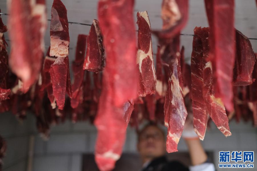 2021年1月2日,在拉薩一民居內,藏族群眾將切好的牦牛肉懸掛在通風處,制作風干肉。新華社記者 晉美多吉 攝