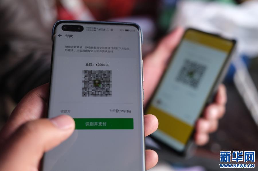 顧客用微信支付剛買的牛羊肉款(2020年12月31日攝)。新華社記者 晉美多吉 攝