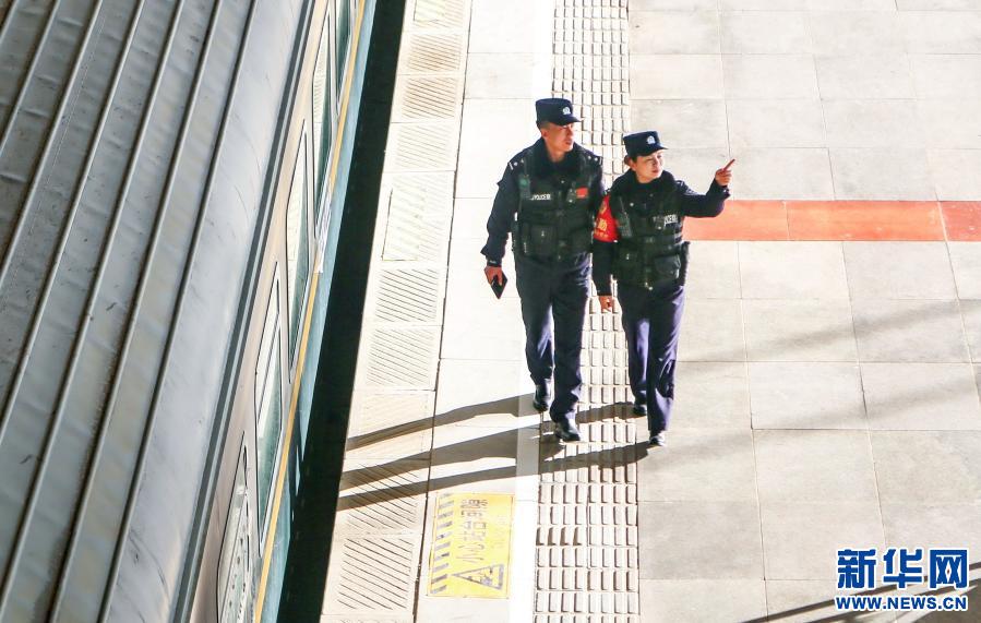 1月10日,“女子格?;ā本M民警雷穎君(右)與同事在火車(chē)站里巡邏。新華社發(fā)(胡安鵬、黃飛攝影報(bào)道)