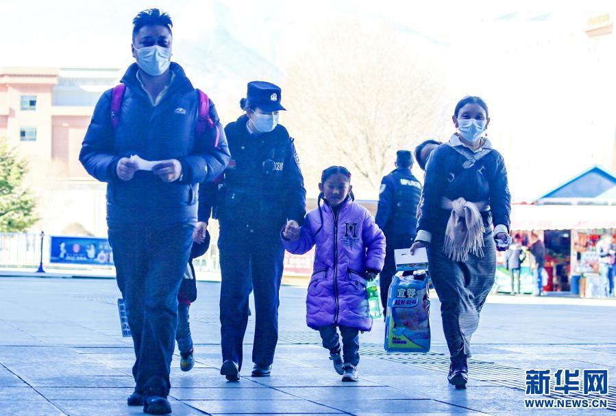 1月10日,“女子格?;ā本M民警在拉薩火車(chē)站帶領(lǐng)小旅客出站。新華社發(fā)(胡安鵬、黃飛攝影報(bào)道)