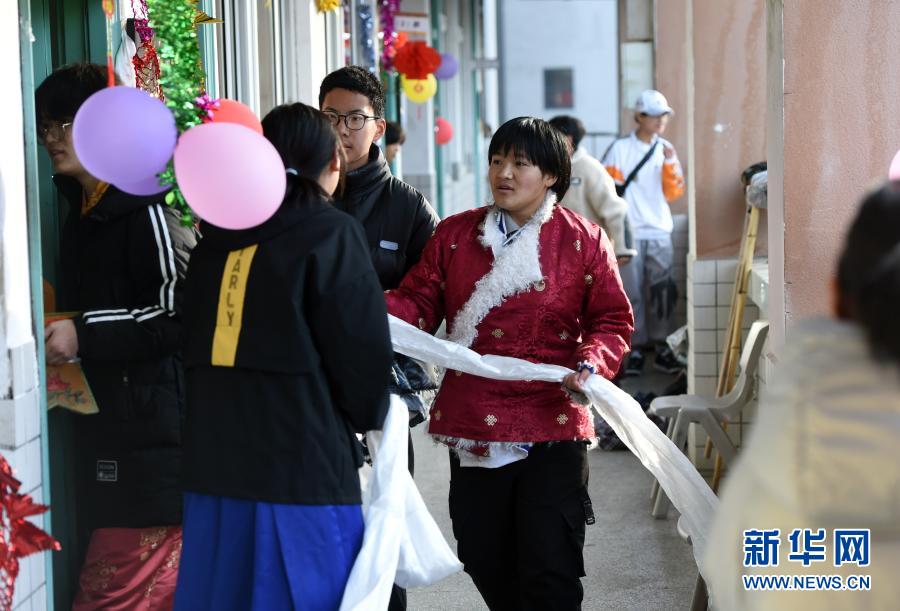 2月12日,合肥市第三十五中學西藏班的學生手捧祈福用的切瑪盒行走在校園內,給老師同學們拜年。新華社記者 周牧 攝