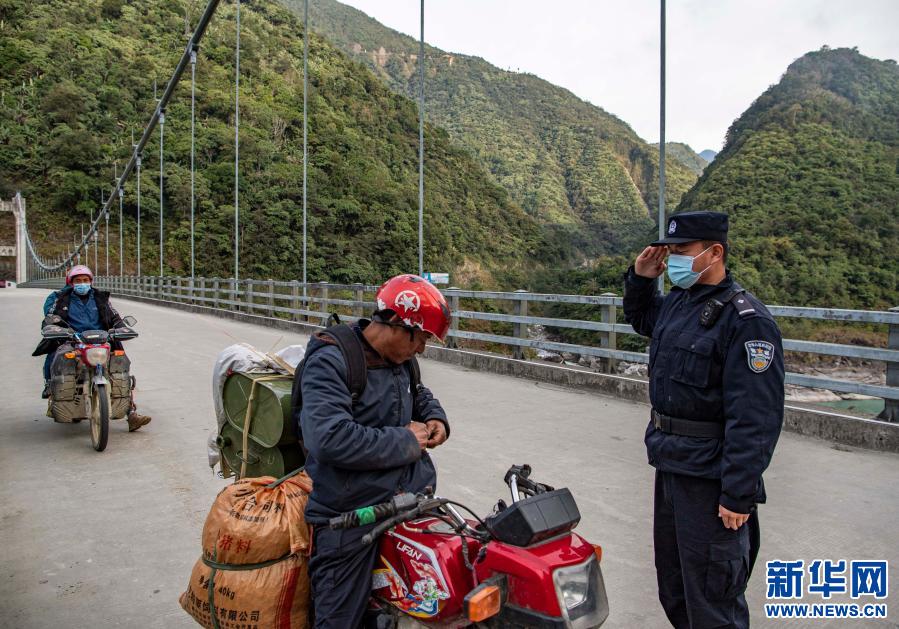 在三代解放大橋上,西藏林芝邊境管理支隊(duì)墨脫大隊(duì)背崩邊境派出所的民警在檢查過(guò)往車(chē)輛和人員(2月10日攝)。新華社記者 孫非 攝