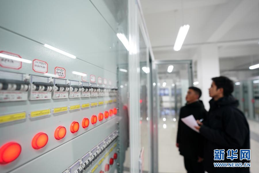 在西藏阿里與藏中電網(wǎng)聯(lián)網(wǎng)工程薩嘎220千伏變電站,工作人員查看設(shè)備運(yùn)行情況(2020年11月27日攝)。新華社記者 詹彥 攝