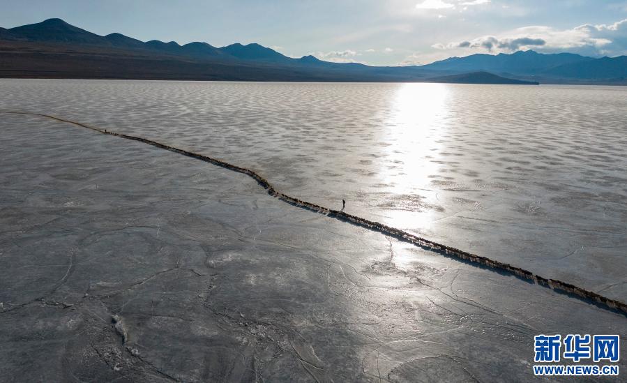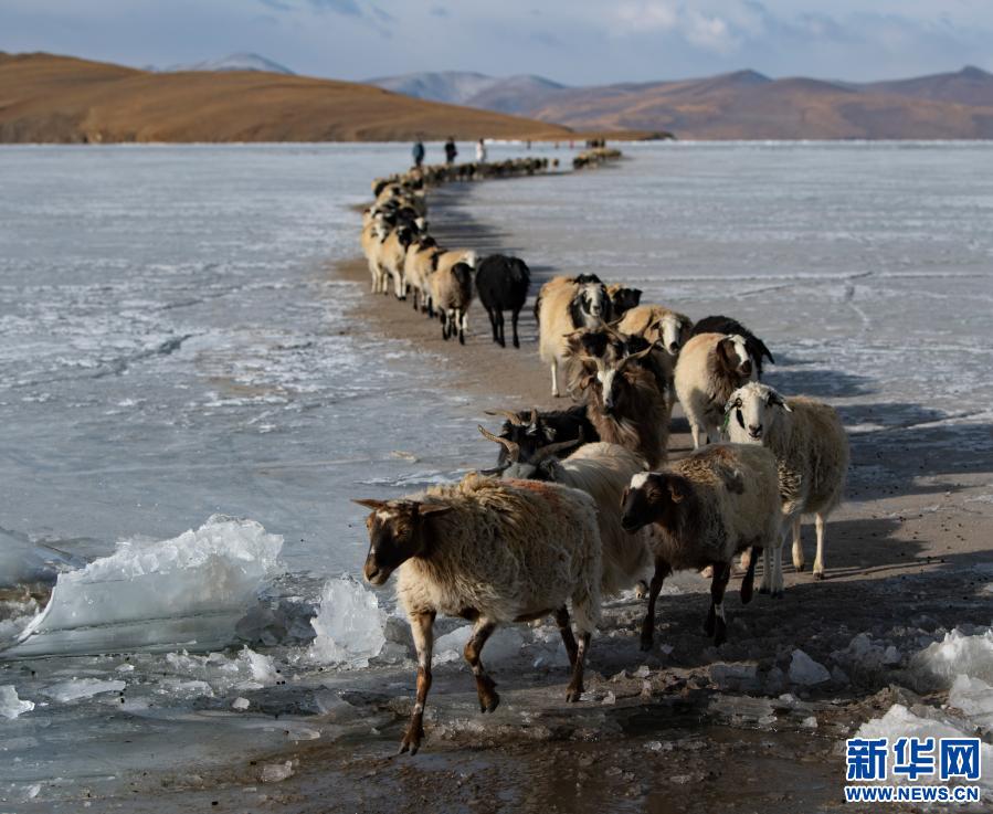 牧羊人趕著羊群,太陽趕著牧羊人。不停向前的羊群在冰湖上拉出長長的隊(duì)形。