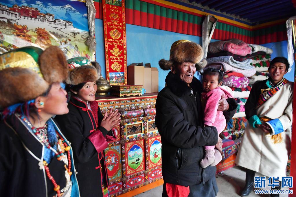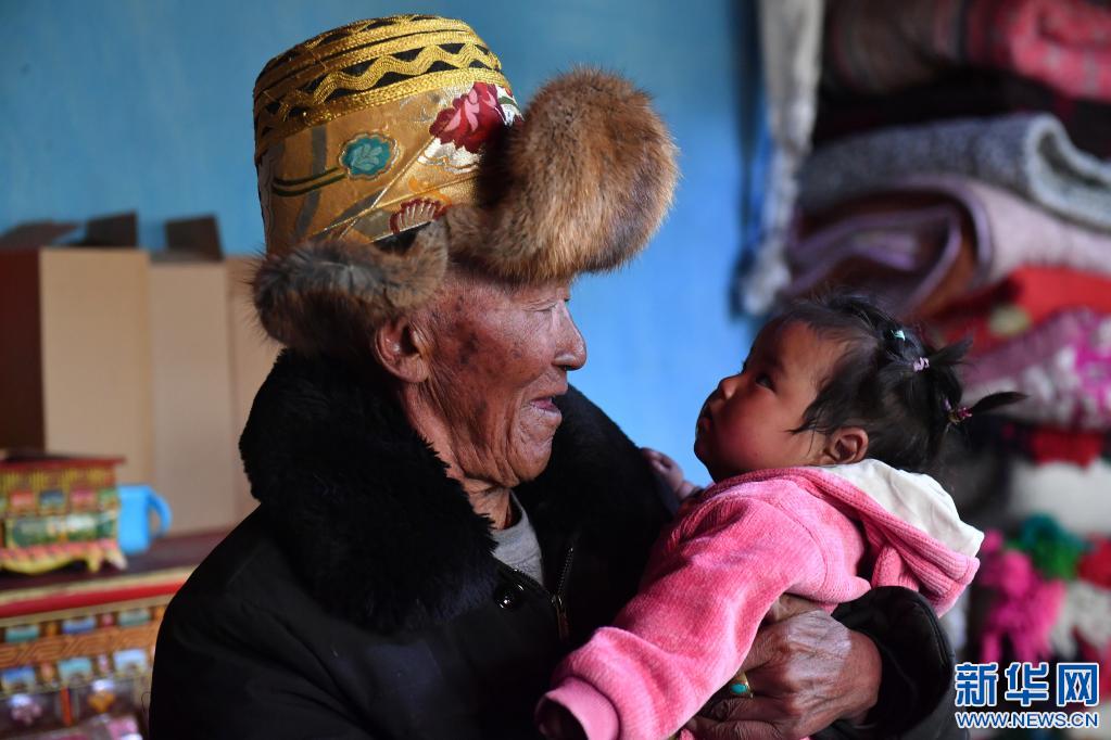 巴桑和九個月大的重外孫女白瑪色珍在一起(3月21日攝)。新華社記者 孫瑞博 攝