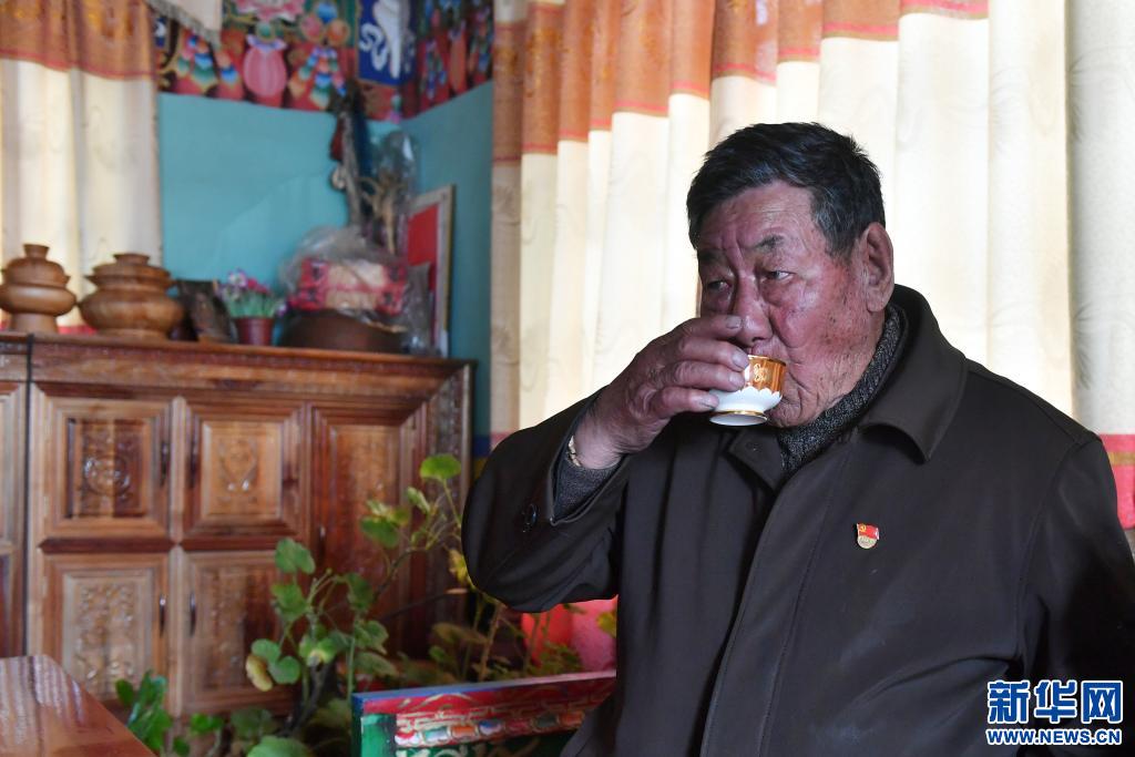 索朗楊佩在位于米林縣單嘎努覺村的家里喝酥油茶(3月30日攝)。新華社記者 孫瑞博 攝