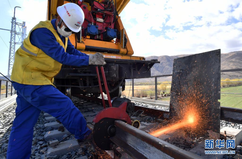 中鐵十一局工人在川藏鐵路拉薩至林芝段進行長鋼軌無縫焊接作業(yè)(2020年4月16日攝)。新華社記者 覺果 攝