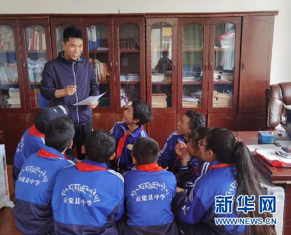 陳洪順向西藏自治區(qū)昌都市貢覺縣中學(xué)的學(xué)生們講授經(jīng)典誦讀技巧(2020年6月22日攝)。新華社發(fā)
