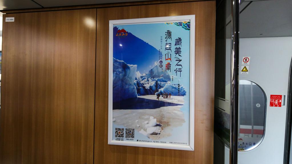 從站臺(tái)開(kāi)始,醒目的車身外彩貼盡入乘客眼中,由此,山南文化旅游的元素就將伴隨乘客的整段旅程。全列車廂,雍布拉康、昌珠古寺、桑耶古鎮(zhèn)、羊卓雍措等旅游目的地與“藏美之行 源起山南”“世界之巔在西藏 西藏之源在山南”等旅游口號(hào)互相輝映,將山南歷史文化與盛景濃縮其中,呈現(xiàn)在旅客面前,讓大家近距離感受山南迷人的美景和悠遠(yuǎn)的歷史。