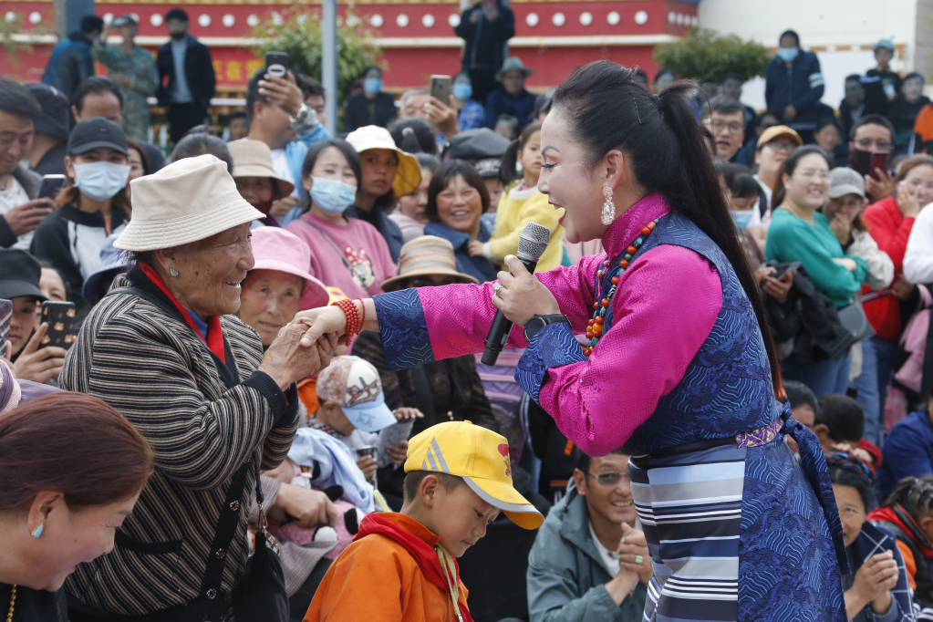 在下鄉(xiāng)途中,德西美朵不僅給群眾演唱,而且還積極向當?shù)乩习傩諏W習民歌。她說:“我希望可以通過我的演繹讓更多人聽到西藏群眾的聲音。”