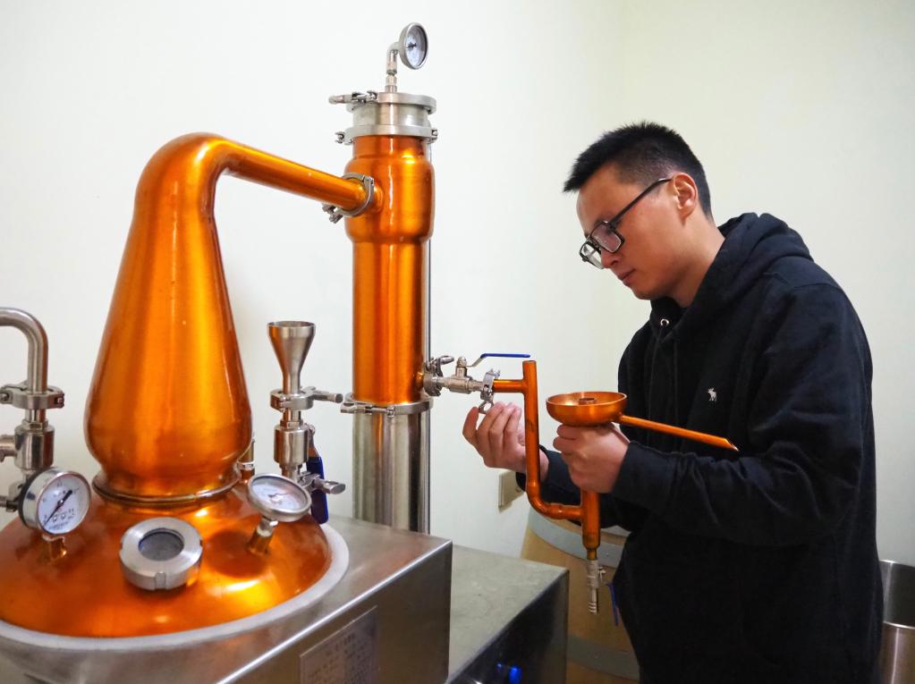 郭江正在調(diào)試釀酒的蒸餾設備。新華社記者 金一清 攝