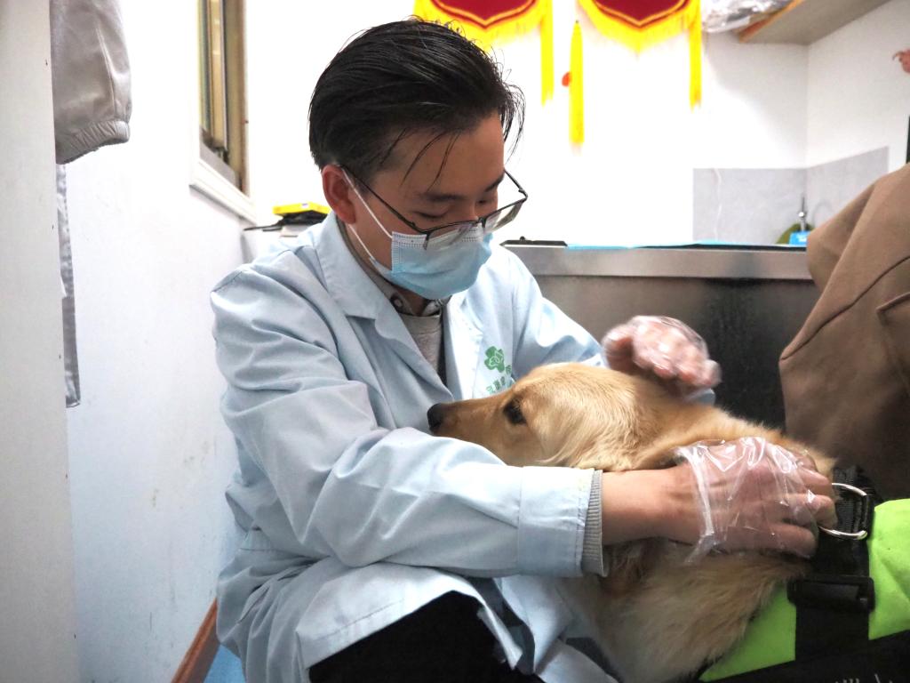 一家不到100平方米的店面,干凈整潔,設備齊全,從體重秤到生化分析儀,應有盡有。薛禎寧抱著一只被雞骨頭卡了腸道的金毛犬,用聽診器做一些初步的檢查。