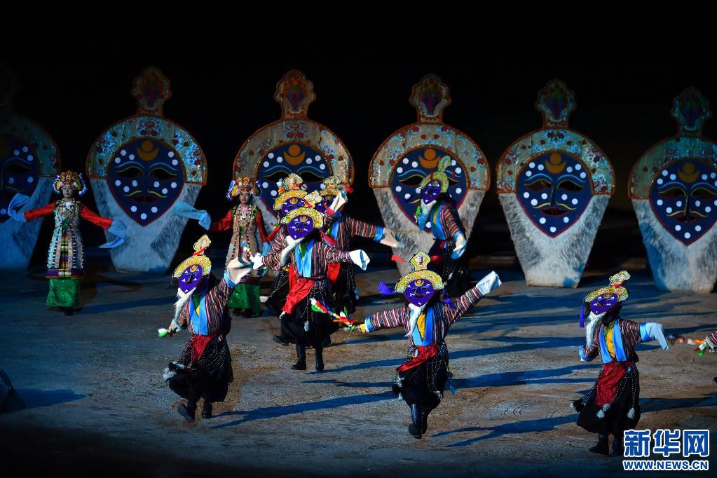 大型實(shí)景劇《文成公主》演職人員共計(jì)800余名,除專職演員外,很多當(dāng)?shù)夭刈遛r(nóng)牧民參與演出,有效促進(jìn)了當(dāng)?shù)厝罕娋蜆I(yè)增收。圖為演員在劇中表演藏戲(2019年10月31日攝)。新華社記者 李鑫 攝