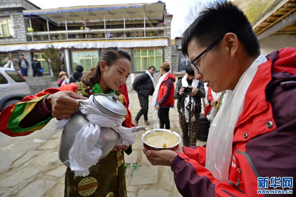 2016年11月15日,在拉薩市城關(guān)區(qū)奪底鄉(xiāng)維巴村,身著盛裝的藏族姑娘德吉為剛抵達(dá)她家的游客斟滿青稞酒。德吉是特色民宿“洛奔曲闊拉薩人家”的主人。新華社記者 劉東君 攝