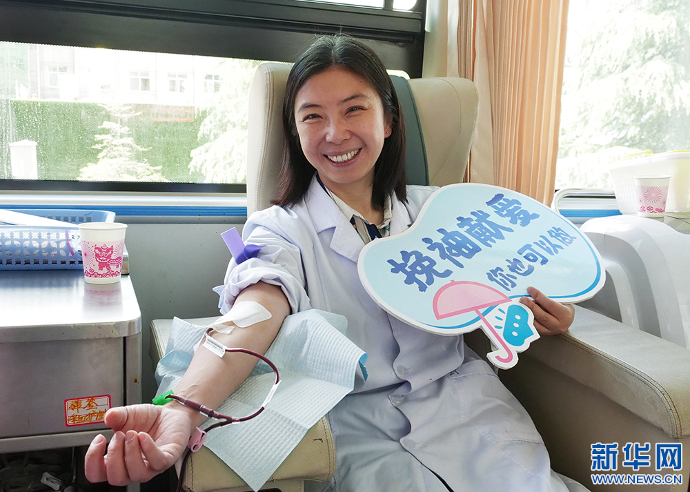 5月27日,來自北京協(xié)和醫(yī)院的援藏專家楊筱在獻血。(新華網(wǎng) 旦增努布攝)