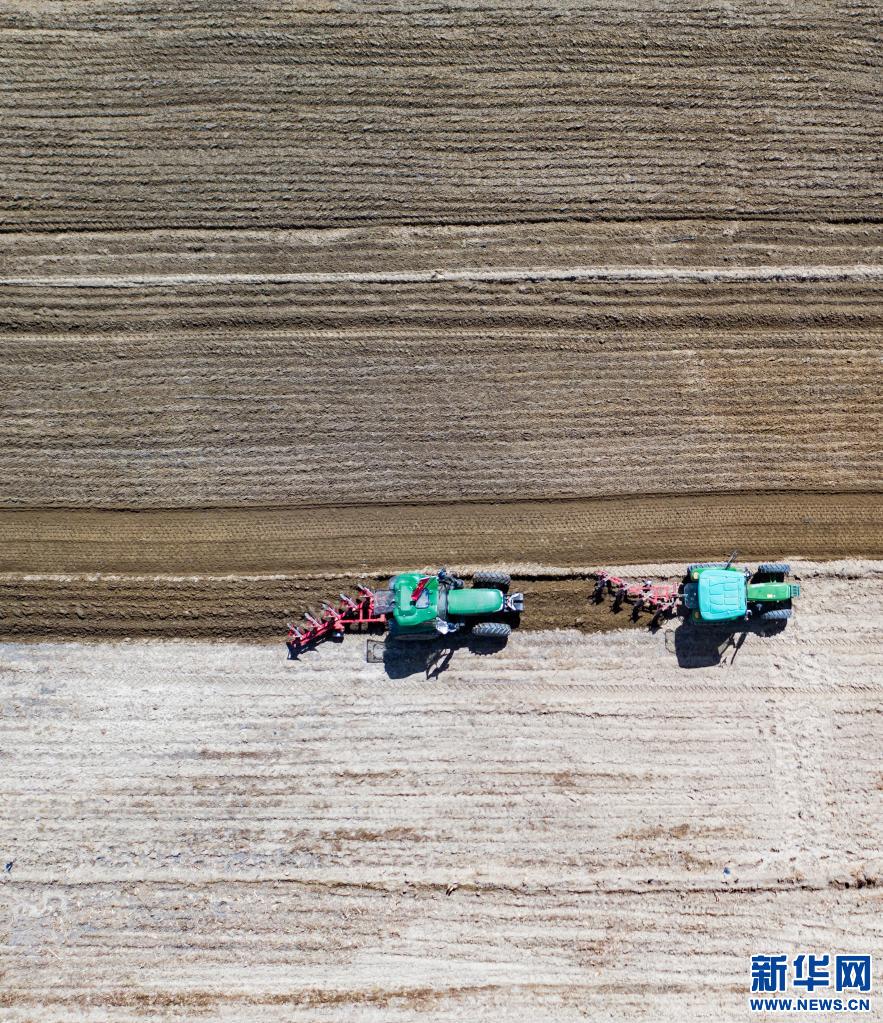 西藏拉薩市曲水縣茶巴朗村農(nóng)民利用機(jī)械設(shè)備播種“藏青2000”(無人機(jī)照片, 2020年4月22日攝)。新華社記者 普布扎西 攝