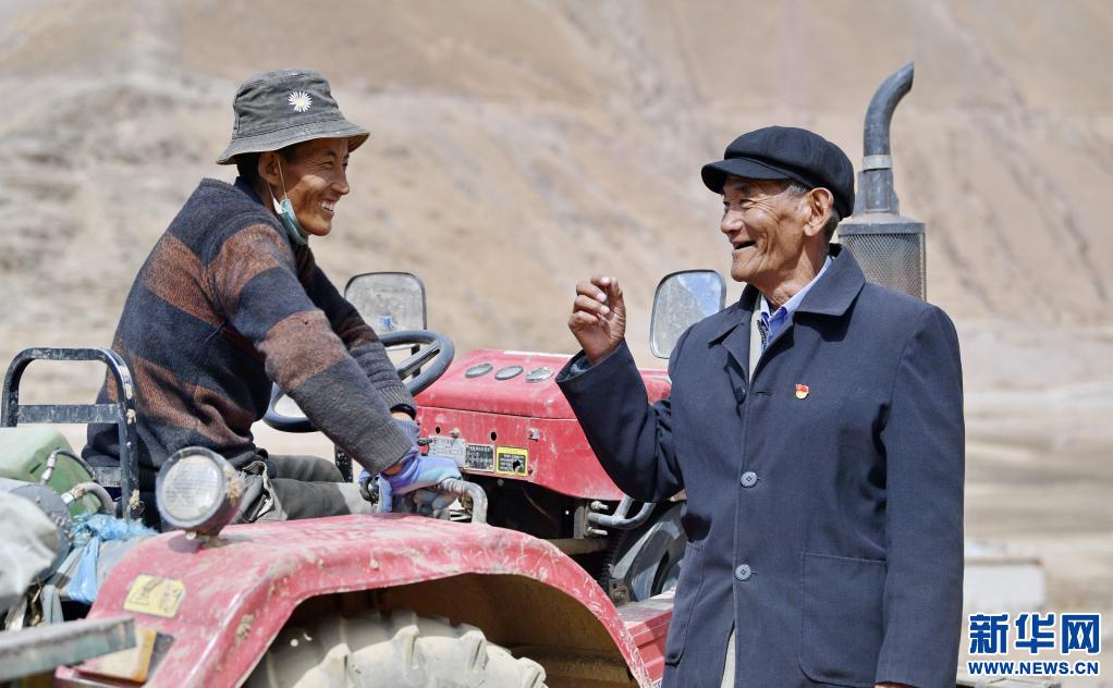 米瑪老人(右)在村里和鄰居聊天(4月18日攝)。新華社記者 張汝鋒 攝