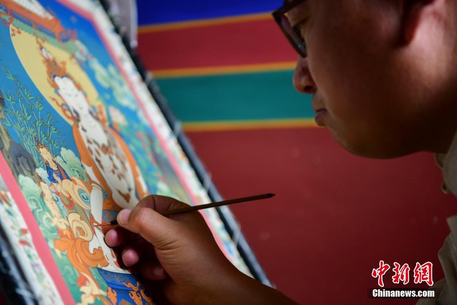 6月12日,2021年“文化和自然遺產(chǎn)日”西藏非遺展演展示系列活動(dòng)在拉薩舉行?;顒?dòng)現(xiàn)場(chǎng)融入了文藝演出、非遺展演、非遺產(chǎn)品展銷等內(nèi)容,市民游客可親身體驗(yàn)非遺產(chǎn)品的制作過程。圖為非遺傳承人在手繪唐卡?!?中新社記者 貢嘎來松 攝