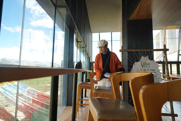 從正門進入,穿過牦牛文化空間走廊,便可到能夠以最佳視角欣賞念青唐古拉山的VR觀景臺。緊鄰觀景臺右側(cè),是一間擺放當?shù)匚膭?chuàng)產(chǎn)品、各類書籍的觀景咖啡廳。該咖啡廳的兩面墻體設(shè)計為超大落地窗,在此休息的游客可以邊品嘗咖啡,邊欣賞念青唐古拉山及拉多草原的美景。走進咖啡廳,記者看到不少在這里休息的游客都在低頭寫著什么,經(jīng)咖啡廳負責人介紹:“這些游客是在寫明信片,我們這里不僅提供餐飲,還提供印有本地風景的明信片,并同中國郵政合作,幫助游客按時將明信片寄到他們的親朋好友手中,讓游客們的旅途變得更有意義。”