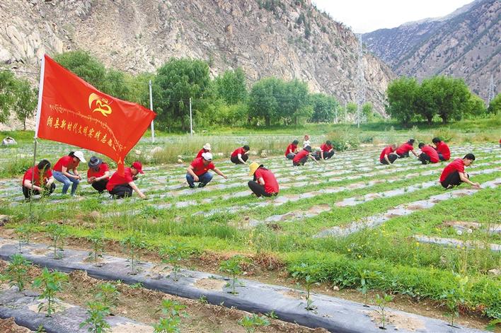 圖為西藏自治區(qū)林芝市朗縣新時代文明實(shí)踐志愿服務(wù)隊(duì)來到洞嘎鎮(zhèn)達(dá)木村,幫助當(dāng)?shù)卮迕窀赊r(nóng)活。