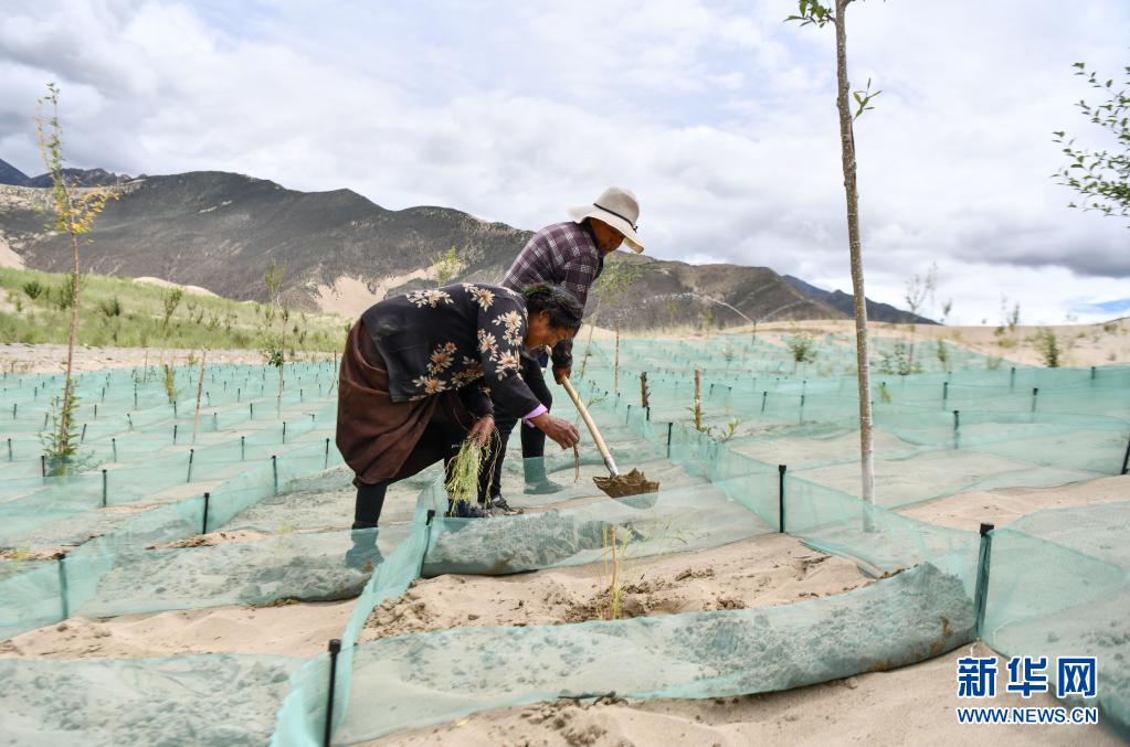 在山南市全國(guó)防沙治沙綜合示范區(qū),當(dāng)?shù)厝罕娫谏车厣显苑N樹(shù)苗(7月20日攝)。新華社記者 晉美多吉 攝