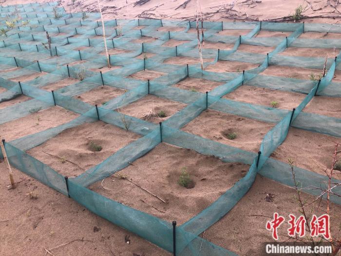 “傳統(tǒng)的方法是用廢樹(shù)枝等擺成方格等一定的形狀壓沙,里面再種上植物,效果很好但樹(shù)枝往往四五年就腐爛了;最近我們?cè)趪L試推廣一種新型化學(xué)材料方格,成規(guī)??欤夷芫S持七到十年。”中國(guó)科學(xué)院西北生態(tài)資源研究院研究員常學(xué)向?qū)τ浾哒f(shuō)。