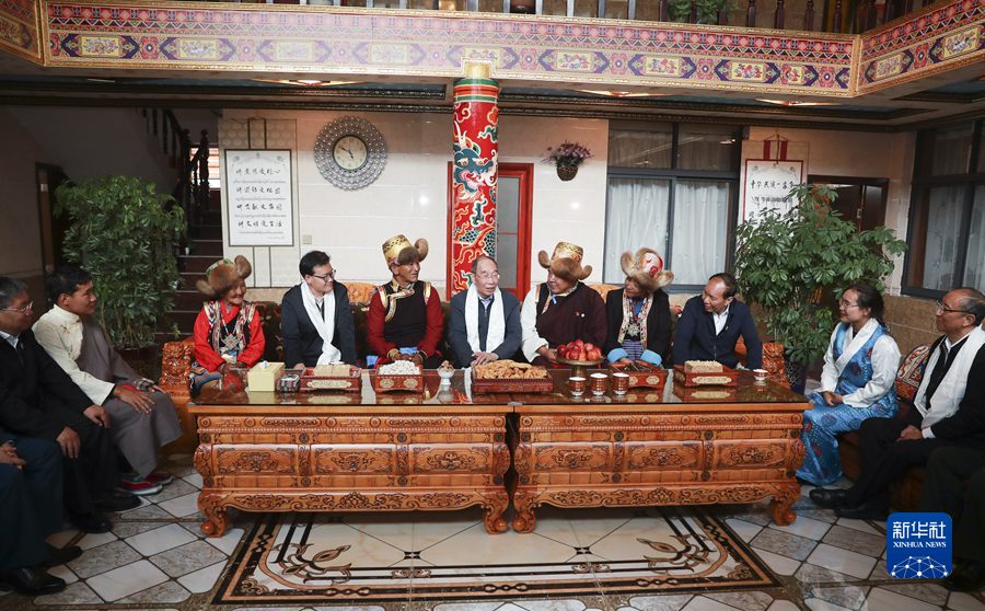 8月20日,中央代表團(tuán)山南、日喀則分團(tuán)帶著以習(xí)近平同志為核心的黨中央的深切關(guān)懷和全國(guó)人民的深情祝福,分別看望慰問(wèn)當(dāng)?shù)馗髯甯鹘绺刹咳罕?。這是中共中央書記處書記、中央統(tǒng)戰(zhàn)部部長(zhǎng)、中央代表團(tuán)副團(tuán)長(zhǎng)尤權(quán)率山南分團(tuán)在山南市乃東區(qū)昌珠鎮(zhèn)扎西曲登社區(qū)走進(jìn)居民次仁家看望慰問(wèn)。新華社記者 丁林 攝