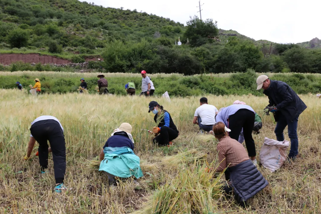 在向巴桑丁、向巴曲西兩戶群眾的青稞地里,市委統(tǒng)戰(zhàn)部干部職工高挽袖子,手握鐮刀,忙碌起來(lái),干活一個(gè)比一個(gè)有勁,像是在參加比賽。收割中,會(huì)干農(nóng)活的成了“師傅”,一邊做示范一邊向“徒弟”們解說割青稞技巧。