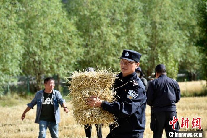 一陣忙碌過(guò)后,大家圍攏在田里聊變化說(shuō)發(fā)展。慶祝西藏和平解放70周年大會(huì)剛剛舉行,大家聊著現(xiàn)場(chǎng)觀禮、收聽(tīng)收看的感受。參加現(xiàn)場(chǎng)大會(huì)的民警高揚(yáng)向大家分享現(xiàn)場(chǎng)感受,講述自己在西藏生活學(xué)習(xí)工作22年的發(fā)展變化和入警初心。歡聲笑語(yǔ)過(guò)后,大家又忙碌起來(lái)。田間地頭藏青藍(lán)的身影,與金黃麥地構(gòu)成一幅加強(qiáng)民族團(tuán)結(jié)、警民魚(yú)水情深的動(dòng)人畫卷。