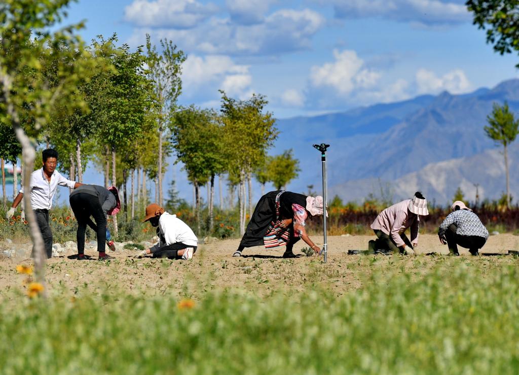 當(dāng)?shù)厝罕娫谏侥鲜性铱h藏草萬畝植物種苗繁育基地勞動(2019年8月29日攝)。新華社記者張汝鋒 攝