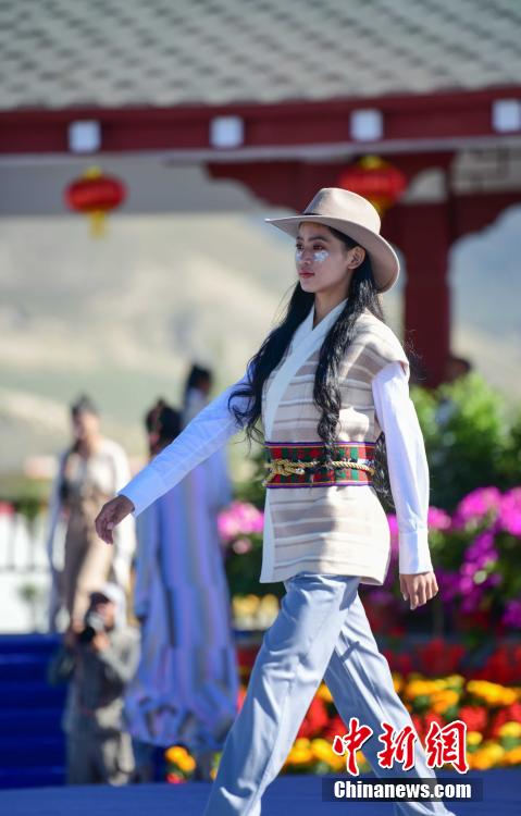 圖為當(dāng)?shù)夭刈迥L厣碇把鹏敳夭肌爆F(xiàn)代藏裝服飾進(jìn)行走秀。貢嘎來(lái)松 攝