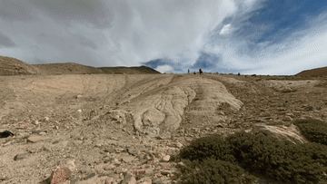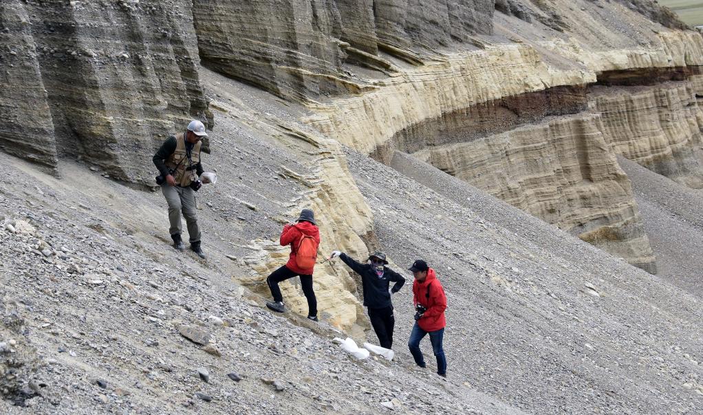 8月27日,科考隊(duì)員王昊(左)等人在西藏日喀則市定結(jié)縣區(qū)域內(nèi)考察一個(gè)垂直地面的沉積剖面。隊(duì)員們根據(jù)傾斜層理判斷,數(shù)萬(wàn)年前這里是一個(gè)巨大的堰塞湖。新華社記者杜剛 攝