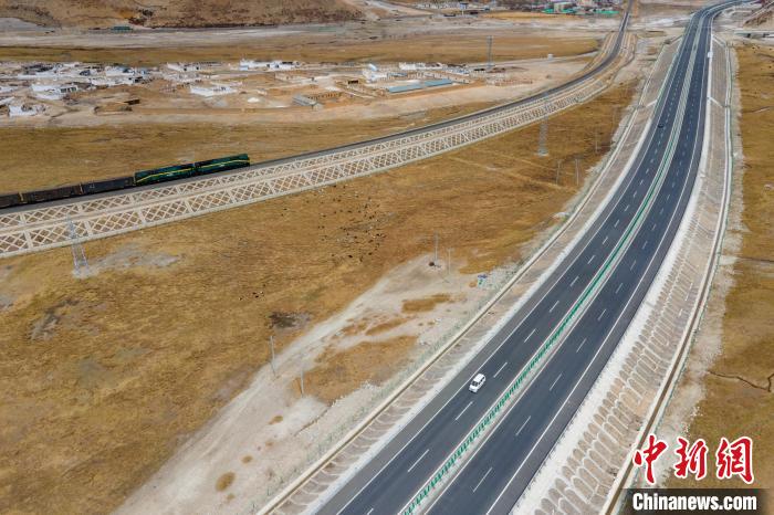 圖為一列進藏火車經(jīng)過G6京藏高速西藏羊八井路段?!〗w波 攝