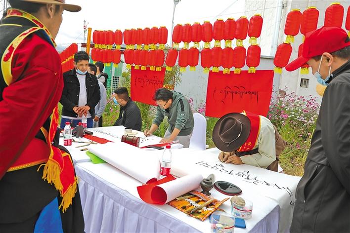尼木縣書(shū)法愛(ài)好者揮毫潑墨寄托祝福。格桑倫珠 黃志武 攝