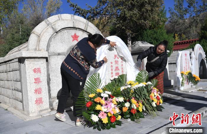 圖為9月30日,在西藏自治區(qū)拉薩市烈士陵園,群眾向孔繁森墓碑敬獻鮮花、哈達。貢嘎來松 攝