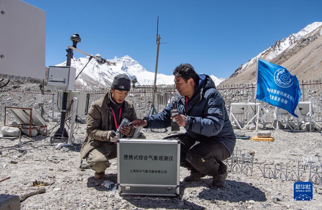 西藏自治區(qū)氣象局工作人員在珠峰大本營自動氣象站組裝便攜式綜合氣象觀測儀,為2020珠峰高程測量活動提供氣象保障(2020年5月10日攝)。新華社記者 普布扎西 攝