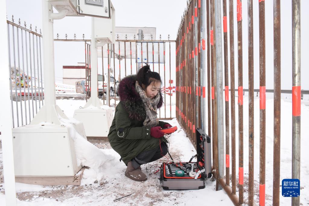 洛松拉姆在世界海拔最高有人值守氣象站——安多氣象局唐古拉山交通自動氣象站準(zhǔn)備檢修設(shè)備(2019年1月28日攝)。新華社記者 周健偉 攝