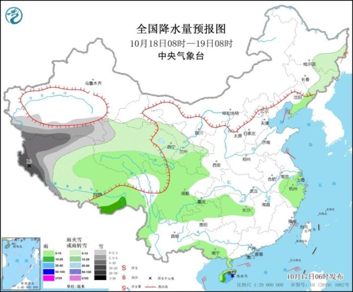 10月17日08時至18日08時,內(nèi)蒙古東北部、新疆南疆西部山區(qū)等地部分地區(qū)有小到中雪,其中,西藏西部等地部分地區(qū)有大雪(5~7毫米)。海南島等地部分地區(qū)有中到大雨,其中,海南島東南部等地部分地區(qū)有暴雨(50~80毫米)。內(nèi)蒙古中部、西藏北部等地部分地區(qū)有4~5級風(fēng)(見圖1)。