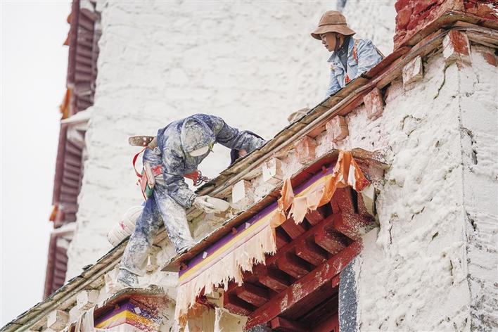 每年布達拉宮開始粉刷時,就會有很多市民群眾自發(fā)前來加入到粉刷工作中?!白?018年開始,我每年都會過來參與粉刷工作,今年我還把朋友帶過來了,為布達拉宮粉刷盡一份力?!眮碜粤种芸h的扎西卓嘎說。