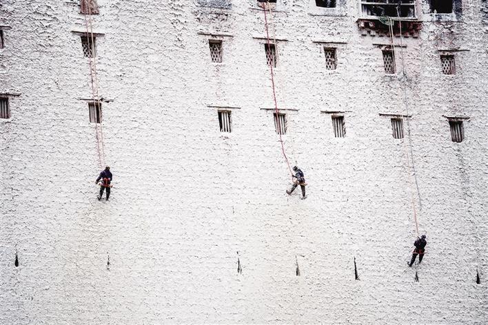 據(jù)悉,工作人員要先對涂料進行過濾,然后再進行噴灑。而人力無法抵達的地方則由專業(yè)人員化身“蜘蛛人”用涂料噴槍進行粉刷。在高空作業(yè)的“蜘蛛人”是經(jīng)過培訓的特定人員,“蜘蛛人”懸掉在空中,并有專人負責拉繩,大家齊心協(xié)力完成粉刷工作。