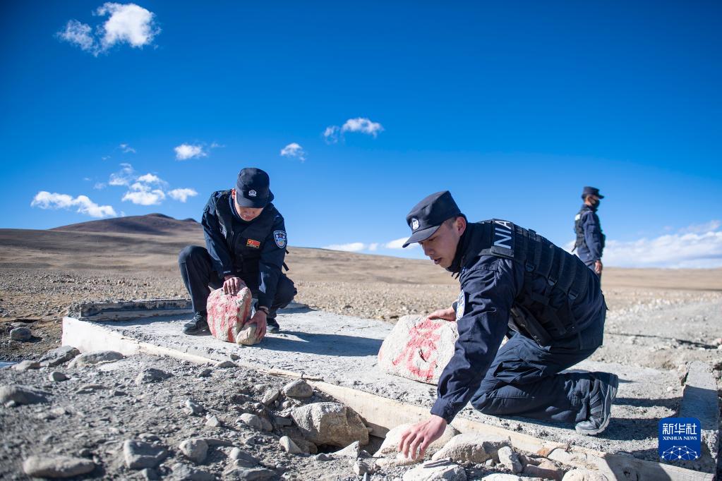 普瑪江塘邊境派出所的移民管理警察們在巡邏時(shí),扶起被大風(fēng)吹倒的就地取材制作的“危橋”警示牌(11月20日攝)。新華社記者 孫瑞博 攝