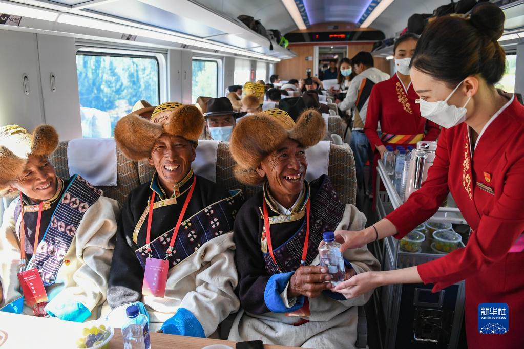 2021年6月25日,全長435公里、設(shè)計(jì)時(shí)速160公里的拉林鐵路建成通車,西藏首條電氣化鐵路建成,同時(shí)復(fù)興號實(shí)現(xiàn)對31個(gè)省區(qū)市全覆蓋。這是6月25日列車員向乘坐首趟復(fù)興號高原內(nèi)電雙源動車組的乘客遞水。新華社記者 普布扎西 攝