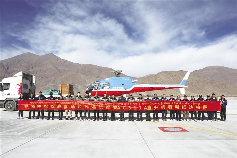 喜迎西藏首架?chē)?guó)產(chǎn)AC311A直升機(jī)。圖由西藏喜馬拉雅通用航空有限公司提供